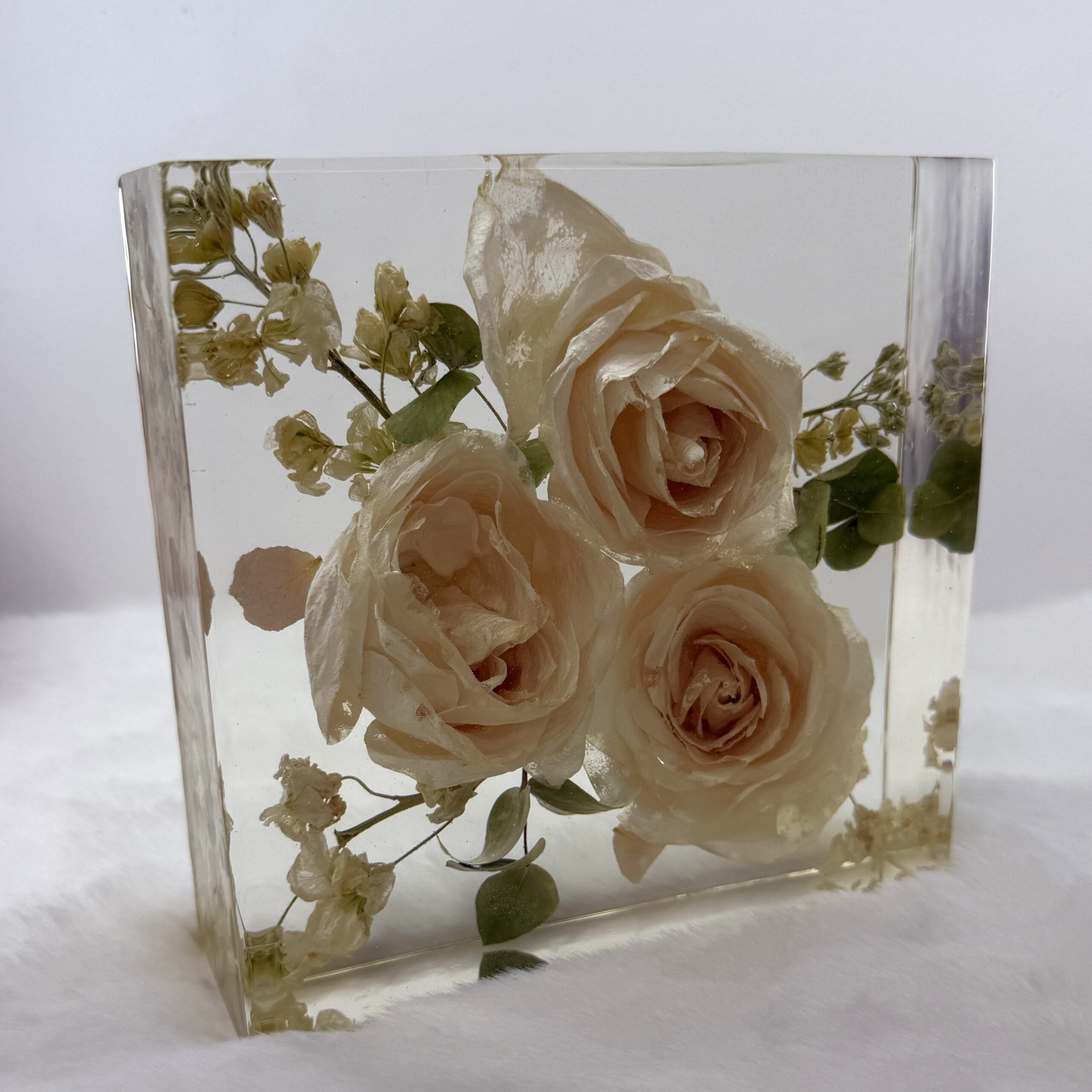 Cuadro de resina encapsulando rosas blancas y otras flores.